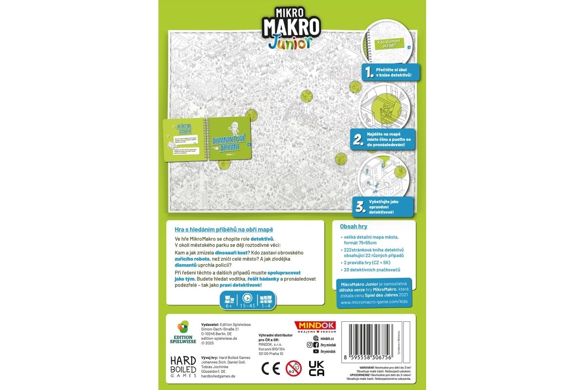 Hra je navržena tak, aby byla přístupná mladším hráčům: kratší úkoly, jasné instrukce a společná kooperativní hra podporují soustředění i radost z objevování. Ideální pro rodiny i samostatné malé detektivy.