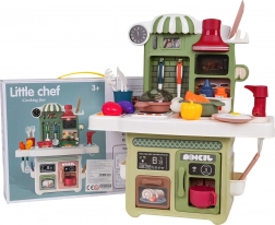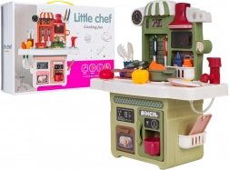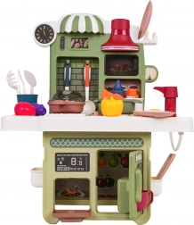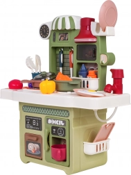 Součástí je funkční kohoutek s oběhovou vodou (na pumpičku), takže si děti mohou „umýt“ nádobí stejně jako v opravdové kuchyni. Nechybí ani maketa kávovaru, osvětlený odsavač par a otevírací trouba. Velké množství doplňků – hrnce, pánve, talířky, náčiní a potraviny – rozšiřuje možnosti hry.