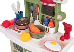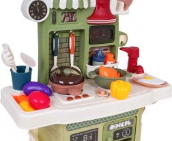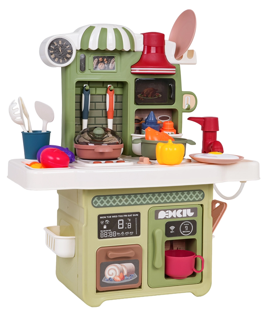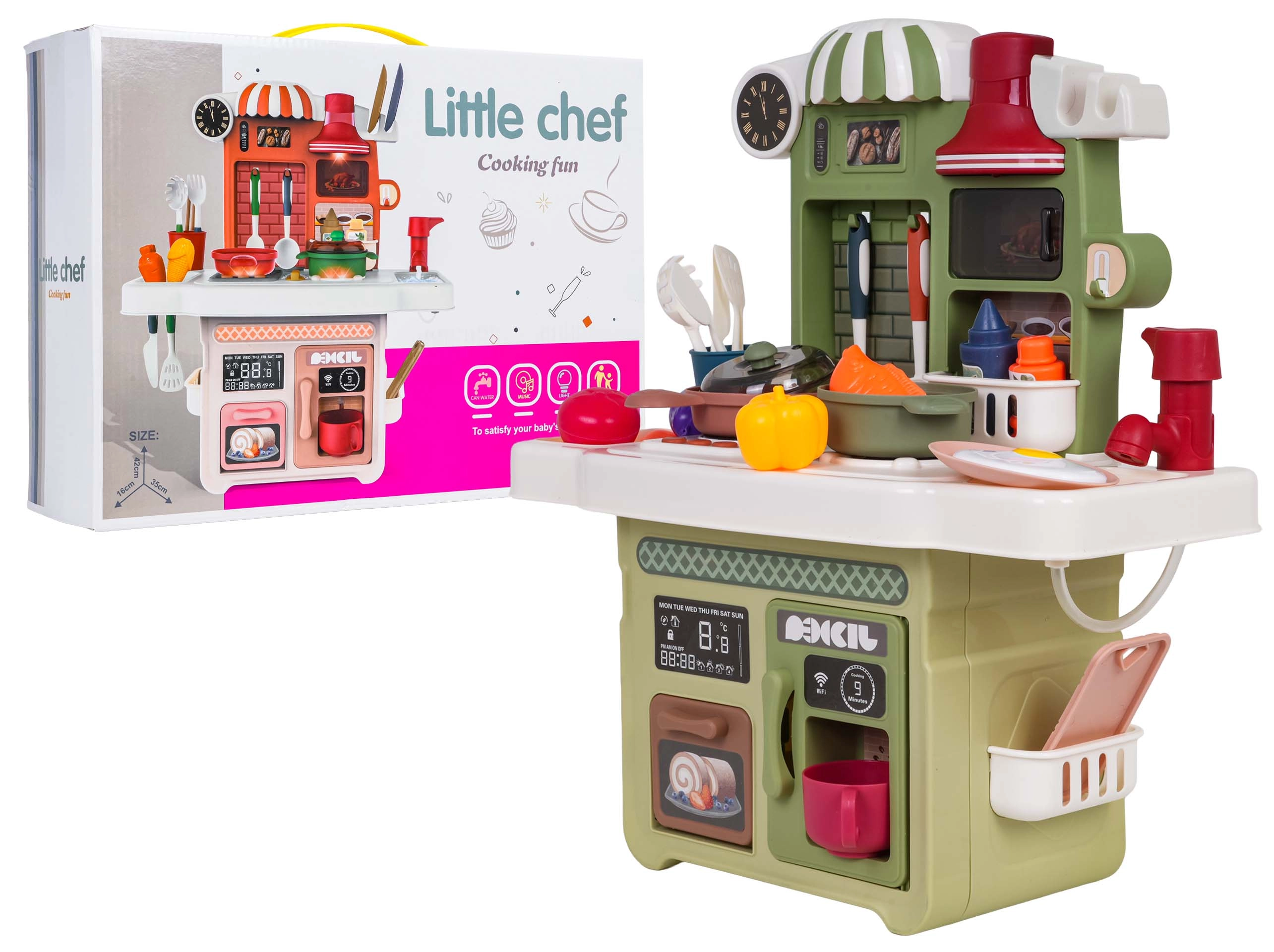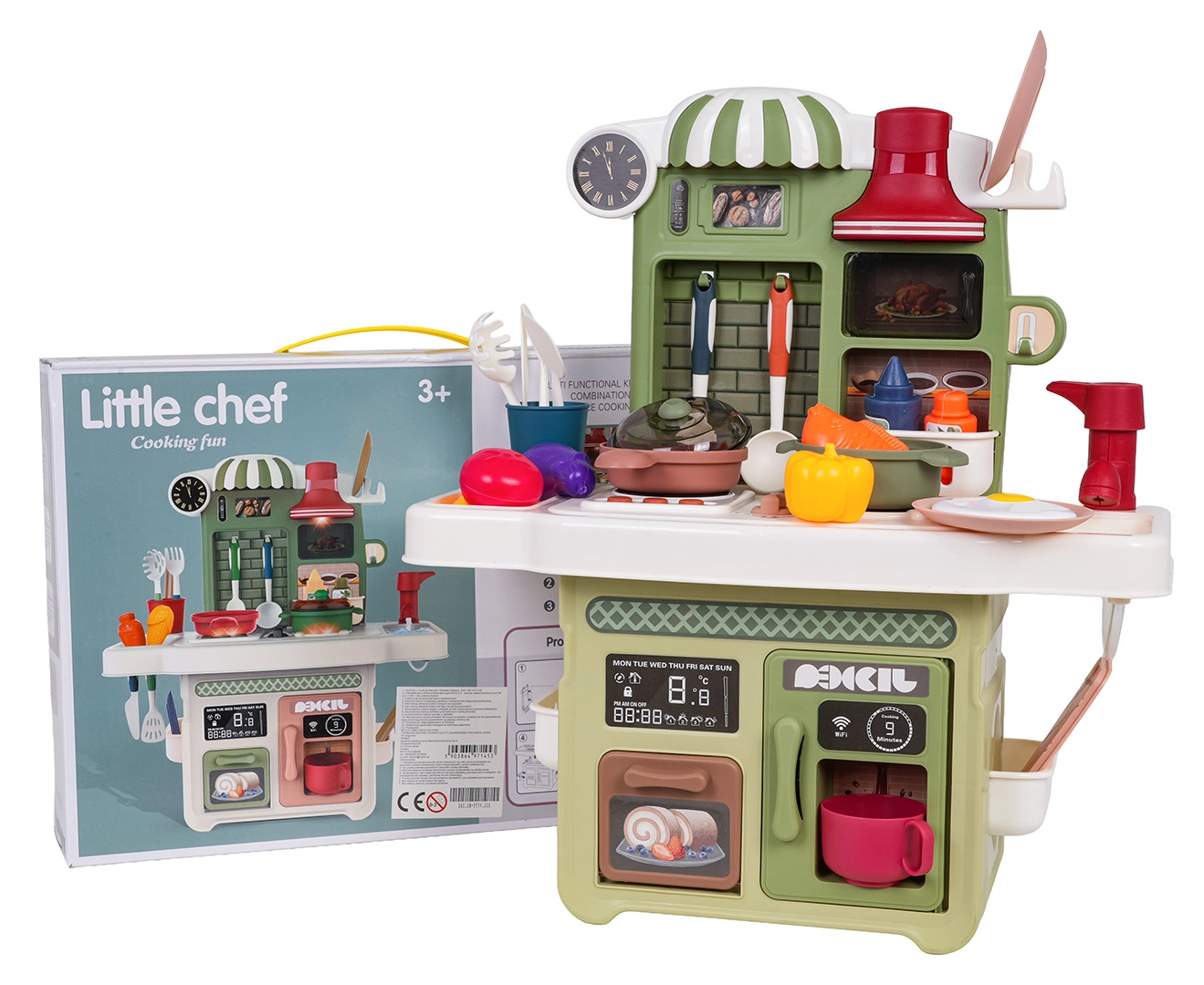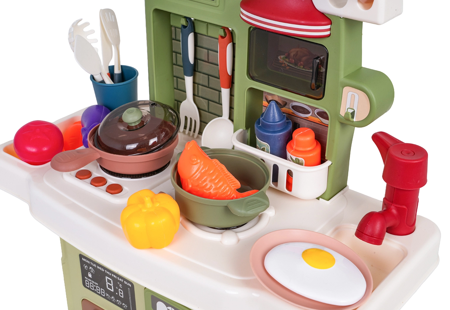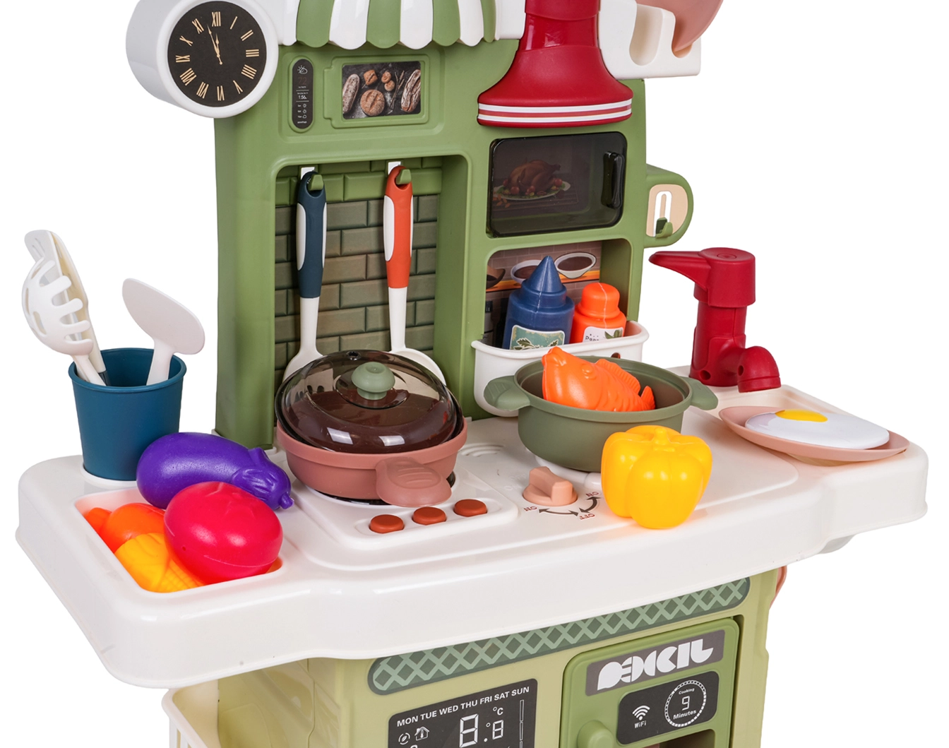 Interaktivní dětská kuchyňka v zelené barvě přináší realistickou zábavu pro malé kuchaře od 3 let. Nabízí světelné a zvukové efekty hořáků, tekoucí vodu z kohoutku na pumpičku, otevírací troubu a bohaté příslušenství. Děti si užijí zvuky vaření a smažení, písničky a říkanky i osvětlený odsavač – vše pro bezpečnou a podnětnou hru na vaření.