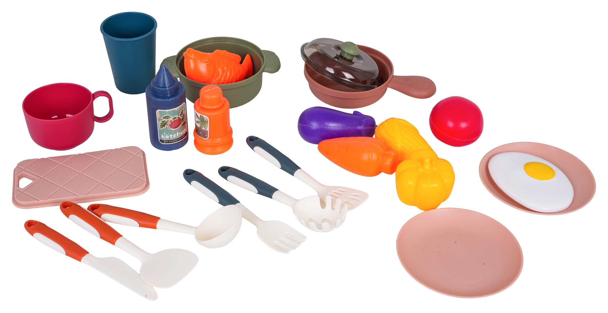 kuchyňka, pánev, hrnec s pokličkou, hrnek, šálek s uchem, prkénko, 2 × talíř, nůž, 2 × obracečka, naběračka, lžíce na těstoviny, velká vidlička, kečup, pepř, hračky potravin: ryba, žlutá paprika, rajče, mrkev, lilek, kukuřice, sázené vejce