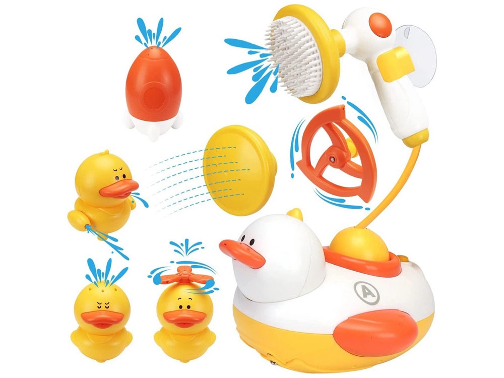 Zábavná plovoucí kachna do koupele promění každý večerní rituál v radostnou hru. Motorček čerpá vodu z vany a přes výměnné nástavce ji rozprašuje, točí a stříká různými způsoby. Součástí je ruční sprška s více hlavicemi, přísavky pro upevnění a bezpečné zaoblené hrany. Skvělé pro rozvoj jemné motoriky a koordinace oko–ruka.