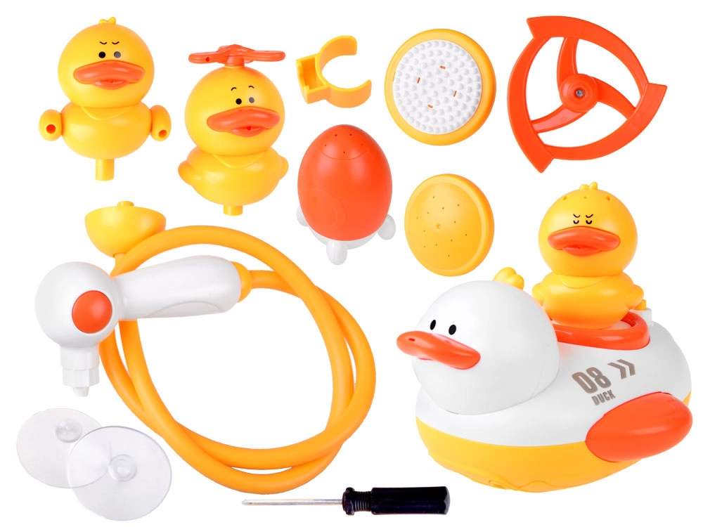 - 1 velká plovoucí kachna, 3 malé kachničky, 1 ruční sprška s hadičkou, 4 sprchové nástavce, 2 přísavky, 1 držák na spršku, 1 šroubovák