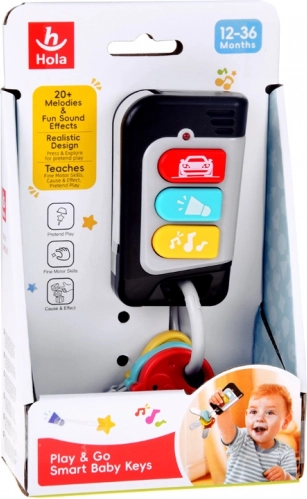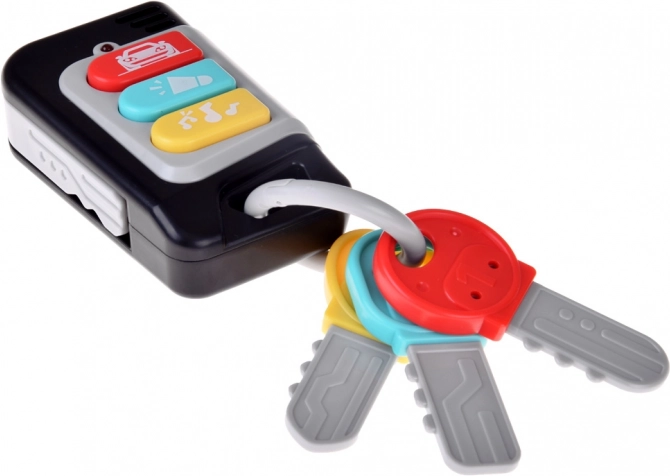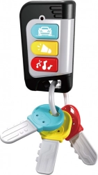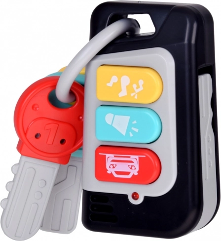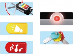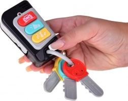 Součástí je sada tří připevněných klíčů barevně sladěných s tlačítky na ovladači a jeden výsuvný klíč připomínající skutečný auto klíč. Různé tvary klíčů rozvíjejí hmat, rozlišování tvarů a pozornost. Hračka skvěle podporuje napodobivou hru, samostatnost a koordinaci oko–ruka.