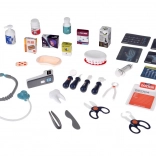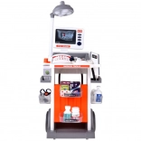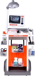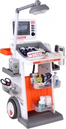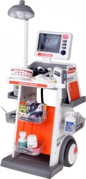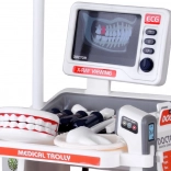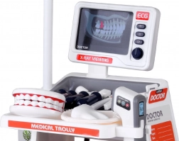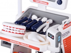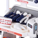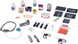 Součástí je široká škála příslušenství: stetoskop, teploměr, zubařské zrcátko s LED, pinzety, nůžky, kartáček, tobolky, krabičky „léků“, model otevírací čelisti i samostatný „zub“, EKG karta a karty rentgenů. Díky mobilní konstrukci a úložným policím je set ideální pro sdílenou hru a udržení pořádku.
