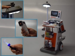 Stetoskop pípá, teploměr vydává signály a svítí červenou LED, zubařské zrcátko má bílou LED a lampa poskytuje teplé, intenzivní světlo. EKG přehrává údery srdce a pípání – atmosféra jako v ordinaci.