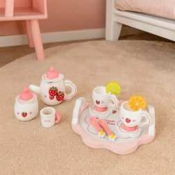 Objevte kouzlo čajového dýchánku s dřevěnou sadou ECOTOYS inspirovanou roztomilým jahodovým motivem. Set realisticky napodobuje skutečné servírování – od konvičky a cukřenky až po plátky citronu a pomeranče. Všechny části jsou z kvalitního dřeva, mají zaoblené hrany a padnou dětským ručkám.