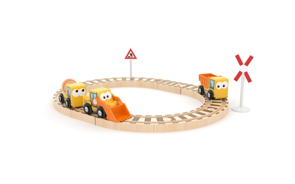 Objevte zábavný dřevěný hrací set s kolejovým okruhem a stavebními stroji, který podporuje fantazii, jemnou motoriku a kreativní hru. Vyrobeno z ekologicky udržitelného dřeva bez chemikálií. Ideální pro děti od 18 měsíců.