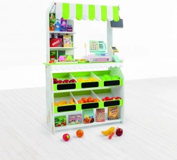Stylový dřevěný hrací set pro malé prodavače rozvíjí komunikační dovednosti, jemnou motoriku a logické myšlení. Je vyroben z kvalitního přírodního dřeva, je bezpečný a šetrný k životnímu prostředí. Díky větším rozměrům se skvěle hodí pro společné hraní více dětí.