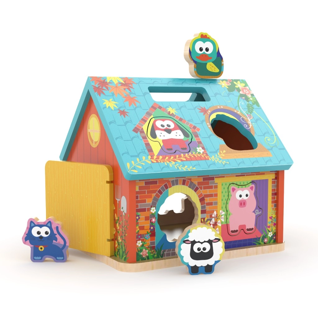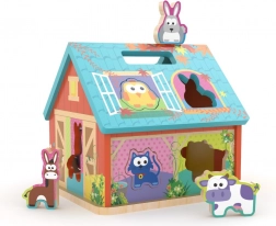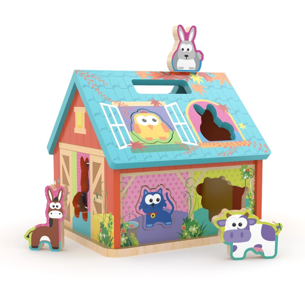 Dřevěný farmářský domeček je zábavná a edukativní vkládačka, která vede děti k objevování tvarů a zvířátek formou hry. Každý dřevěný dílek má své místo – stačí jej správně vložit do odpovídajícího otvoru v domečku. Díky praktickému madlu je hračka snadno přenosná a ukládání dílků zvládnou děti samy díky otevíracím dvířkům.