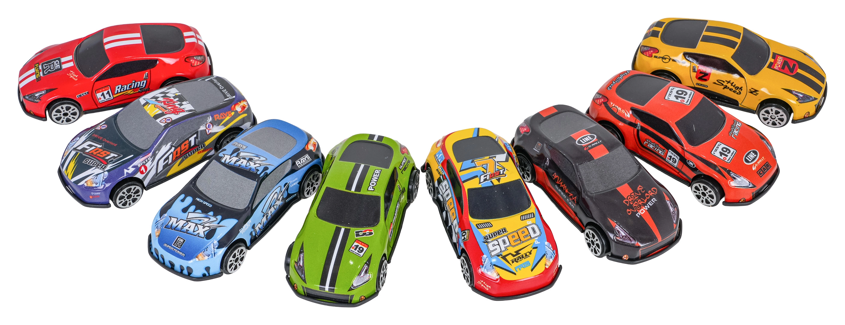 Rozmanitá sada barevných modelů s kovovou karoserií připravená na závody i parkování.