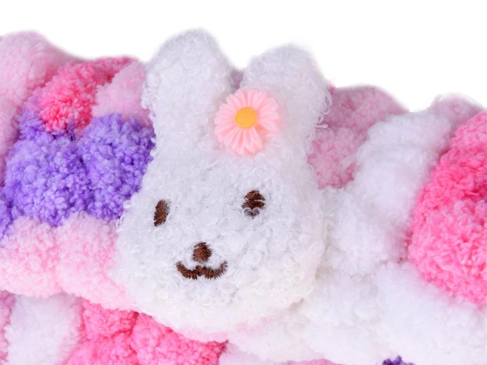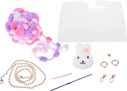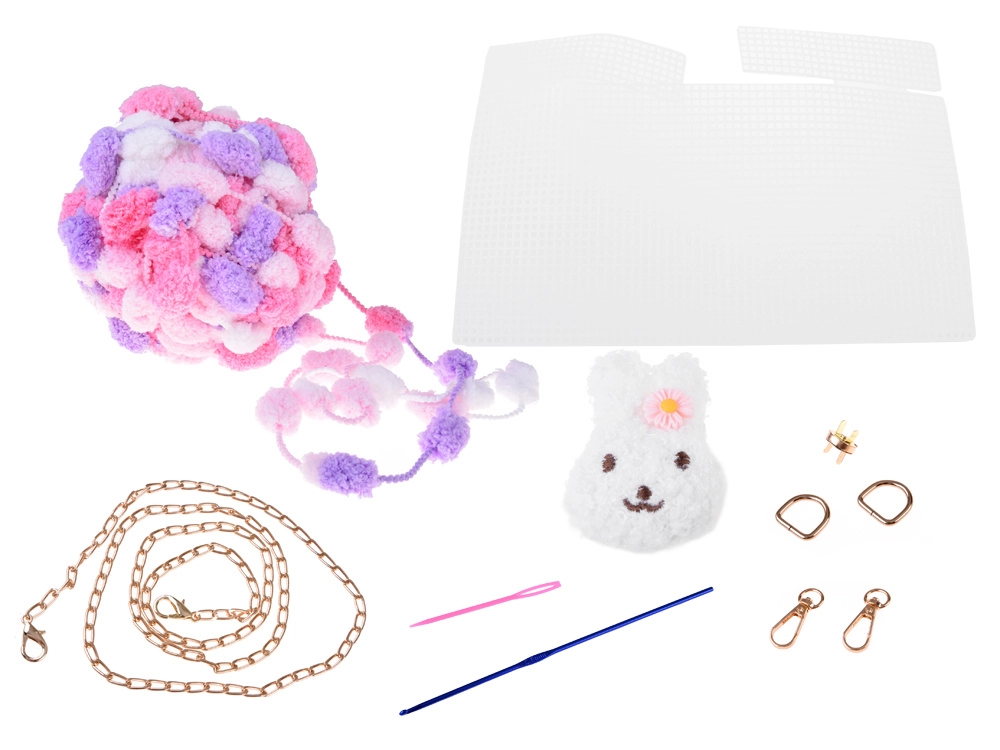 V balení najdete barevnou „pom‑pom“ přízi, plastové plátno jako základ, kovový řetízek, jehly, D‑kroužky, zapínání, korálky na perličkový úchyt a návod s obrázky. Krok za krokem snadno sestavíte originální mini kabelku s králičím motivem, která potěší malé i velké tvořilky.