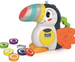 Interaktivní tukan Adrian od CLEMENTONI BABY je skvělým parťákem pro první objevování světa. Po vložení žetonu do zobáku tukan okamžitě reaguje – rozsvítí zobák barvou vloženého ovoce, žeton rozpozná a nahlas ho pojmenuje. Děti tak přirozeně chápou příčinu a následek a učí se barvy i názvy ovoce zábavnou formou.