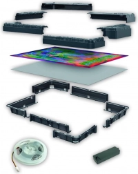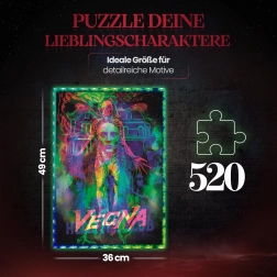 V balení najdete vše potřebné pro sestavení a vystavení hotového díla: puzzle 520 dílků, tvrdý karton pro podklad, lepidlo, montážní plastový rám, elektronický modul a RGB LED pásek, stejně jako referenční plakát a návod. Po složení má obraz rozměr cca 36 × 49 cm a skvěle se hodí jako dekorace s efektem překrytí tří barevných úrovní.