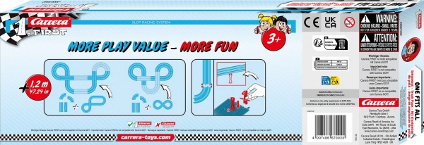 Doplňte svou autodráhu CARRERA FIRST o nový rozměr zábavy s rozšiřujícím setem First Track Pack. Set přináší snadnou instalaci a více variabilních tratí. Obsahuje rovinku, zúžení dráhy a zatáčky s podpěrami pro dynamičtější jízdu a delší herní čas.