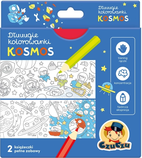 Dlouhé omalovánky Kosmos jsou kreativní sada navržená pro děti od 4 let. Dvě skládací harmonikové knížky přinášejí jedinečný formát: na jedné straně panoramatické scény k vybarvování, na druhé zábavné úkoly. Děti tak mohou objevovat planety, rakety i vesmírné tvory, zatímco rozvíjejí své dovednosti.
