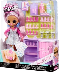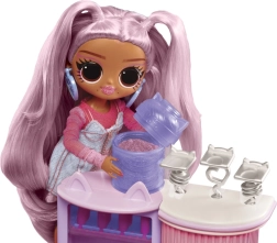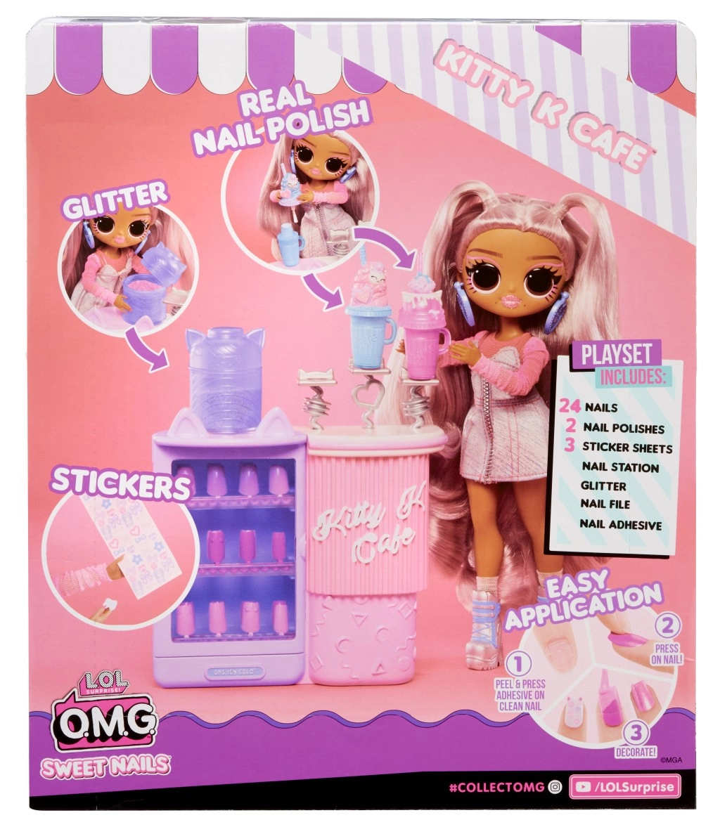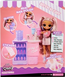 Set obsahuje módní panenku s dlouhými pastelovými vlasy a kloubovým tělem pro skvělé pózování, kavárenský pult Kitty K Cafe s doplňky na servírování nápojů a bohatou sadu nehtových dekorací. Ideální pro kreativní hru, sběratelství a vystavování.