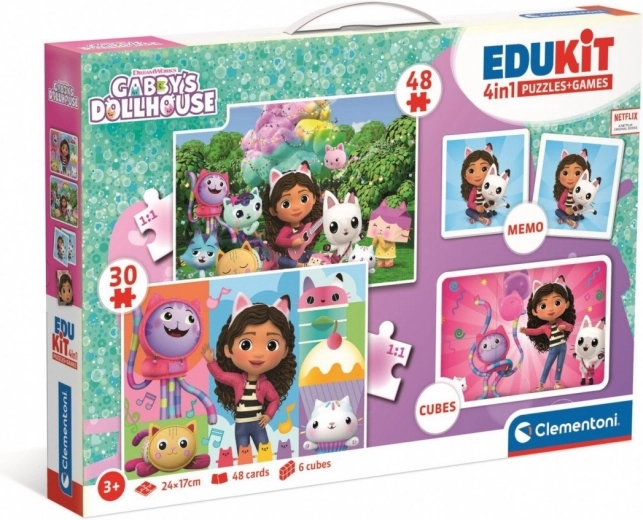 Vzdělávací sada EduKit 4 v 1 Kocí domek GABI přináší čtyři oblíbené aktivity v jednom balení. Děti si užijí skládání dvou puzzlí s 30 a 48 dílky, trénování paměti s memo kartičkami a stavění z 6 kostek. Díky motivům z populárního seriálu je každá hra zábavná, barevná a motivující.