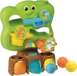 Tento barevný stromek s přátelskými zvířecími motivy je ideální první logická hračka pro batolata. Dítě vkládá kuličky do otvoru v koruně stromu a sleduje jejich cestu po dráze. Každá kulička se objeví za dvířky odpovídající barvy, což přirozeně rozvíjí koordinaci oko–ruka, rozpoznávání barev a pochopení příčiny a následku.