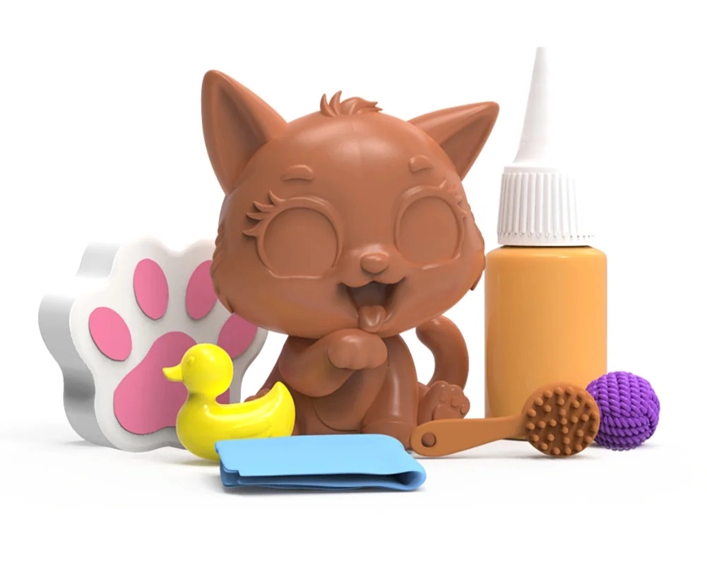 - 1 figurka kotěte, 1 tubička s blátíčkem, 5 doplňků (houbička, kartáček, kachnička, klubíčko, ručníček)