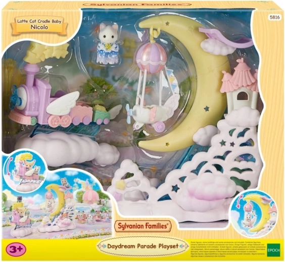 Sada Sylvanian Families Paráda v oblacích přináší dětem poetický svět plný snů. Létající lokomotiva táhne platformu s velkým měsícem a připevněným balónkovým letadélkem, které se při jízdě jemně houpe. Součástí je roztomilá figurka koťátka Latte v kostýmu padající hvězdy, připravená na kouzelné lety.