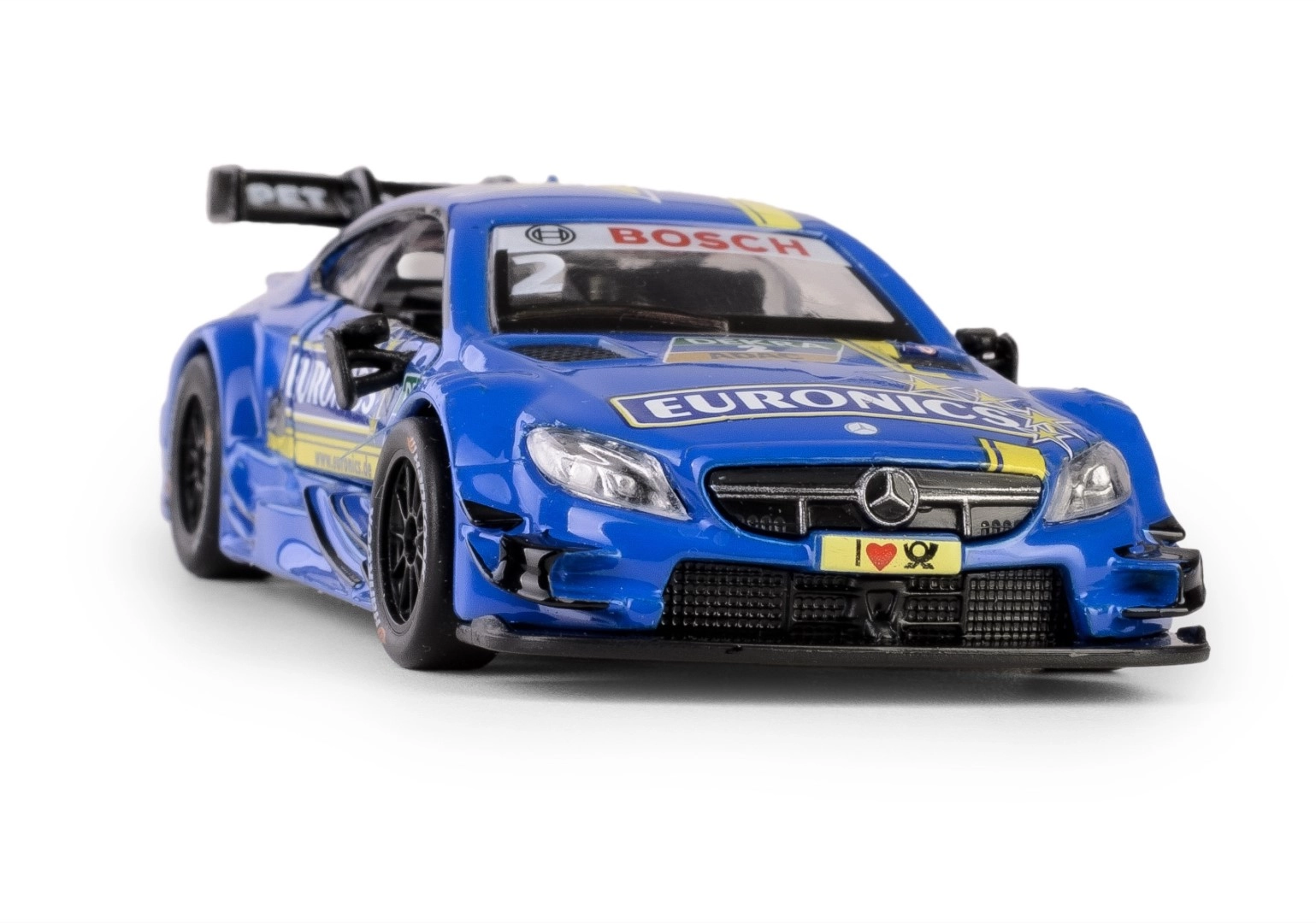 Autentický modrý model závodního vozu MERCEDES‑AMG C 63 DTM v měřítku 1:43 kombinuje kov a plast pro vysokou odolnost a realistické detaily. Nabízí otevírací boční dveře, gumové pneumatiky a zábavný natahovací (pull‑back) pohon. Ideální pro děti od 3 let i sběratele, splňuje evropské bezpečnostní normy CE.