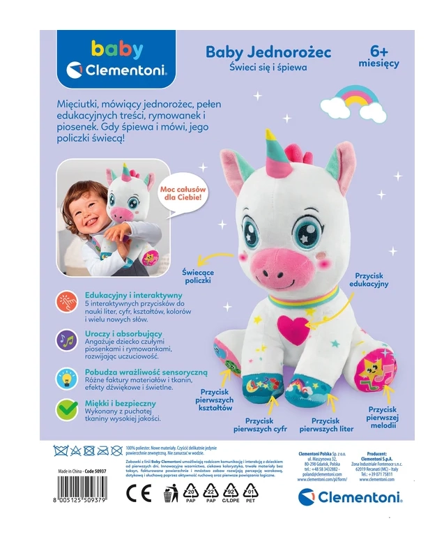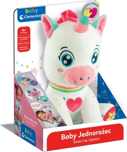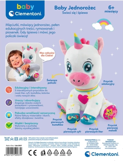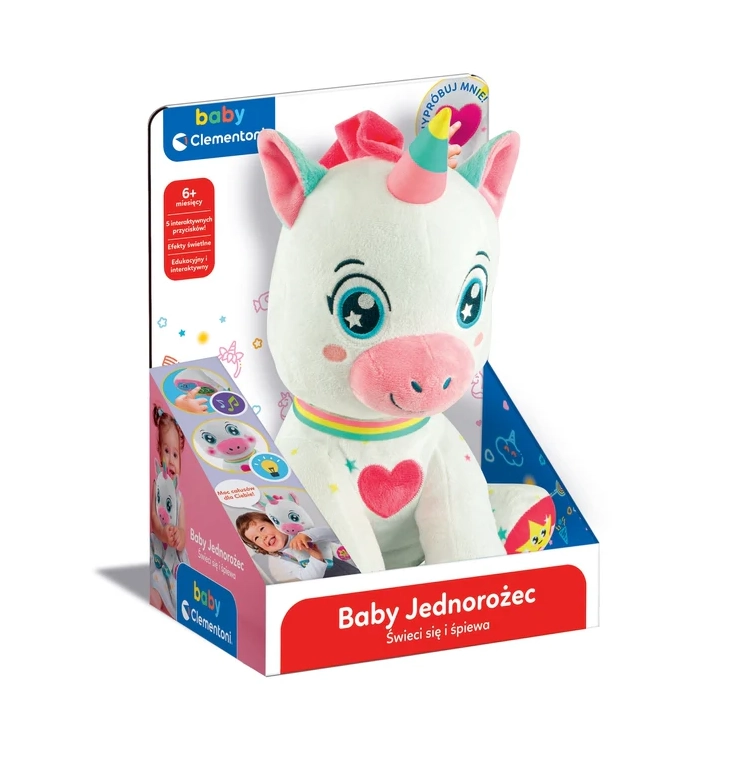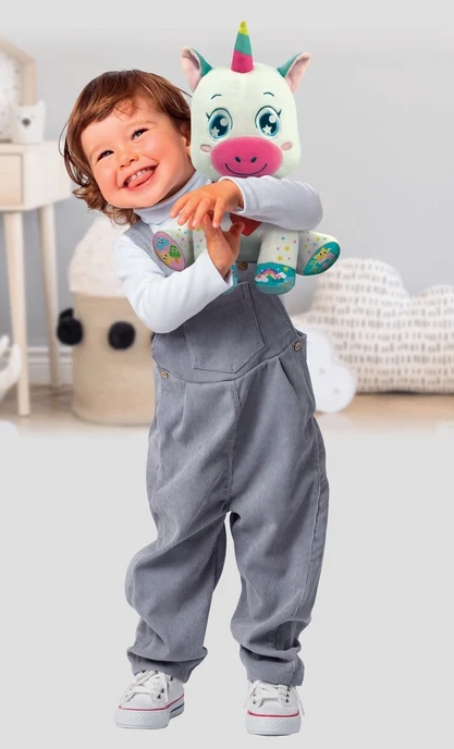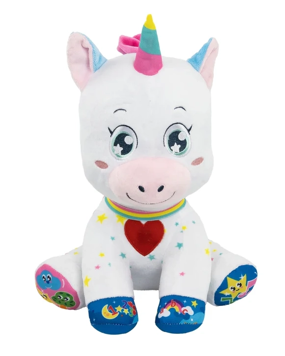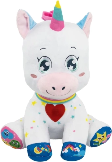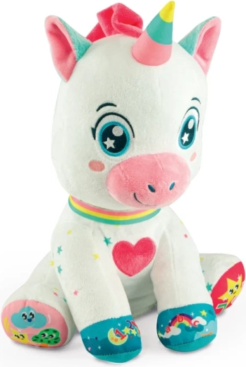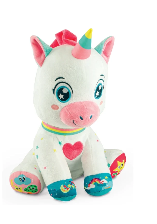 Roztomilý interaktivní jednorožec od BABY CLEMENTONI potěší děti od 6 měsíců. Má 5 dotykových tlačítek na tlapkách a srdíčku, která spouštějí zvuky, písničky a říkanky a učí písmena, čísla, tvary a barvy. Měkké, netoxické materiály, podsvícené tvářičky a svítící roh podporují vizuální vnímání, jemnou motoriku a rozvoj slovní zásoby.