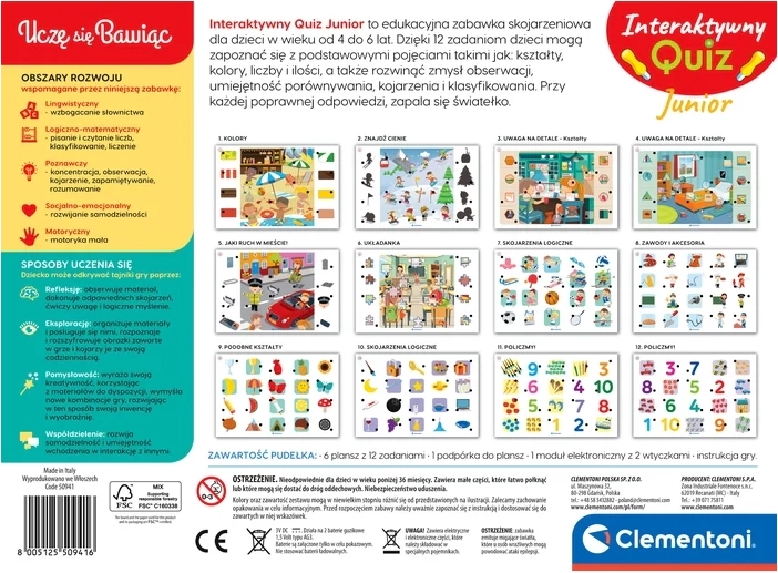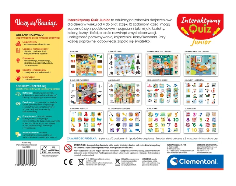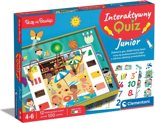 Objevte zábavnou vzdělávací hru pro nejmenší! Interaktivní kvíz junior od Clementoni nabízí 12 aktivit a více než 1000 ilustrovaných kvízů, které dětem ve věku 4–6 let pomáhají hravou formou rozvíjet poznávání tvarů, barev, čísel a množství. Při každé správné odpovědi se rozsvítí světélko, které motivuje k dalšímu učení.