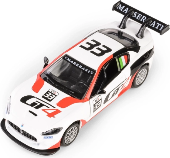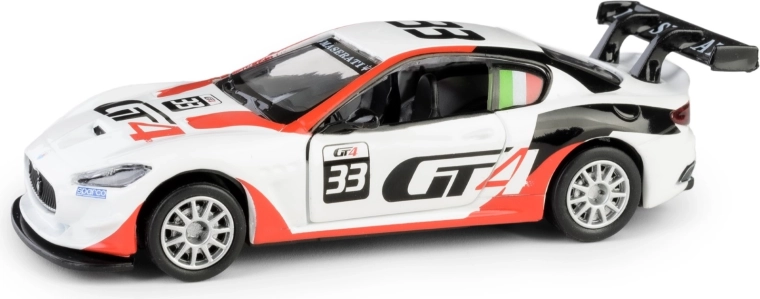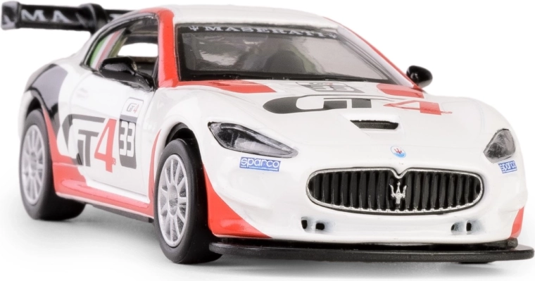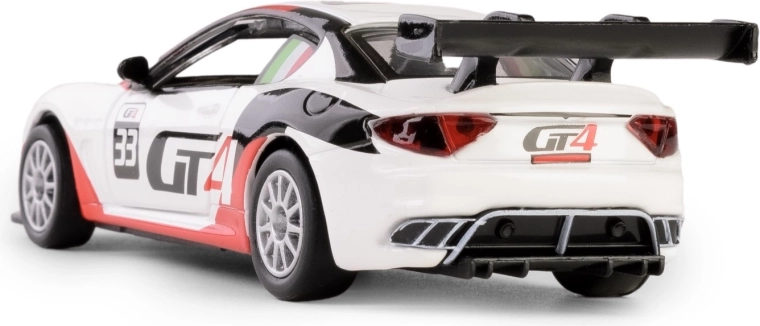 Objevte precizní repliku sportovního vozu MASERATI GranTurismo MC GT4, která v měřítku 1:43 věrně zachycuje charakter a sportovní eleganci originálu. Bílý model z odolné kombinace kovu a plastu nabízí realistický interiér viditelný po otevření bočních dveří a jízdní zážitek díky pull-back pohonu.