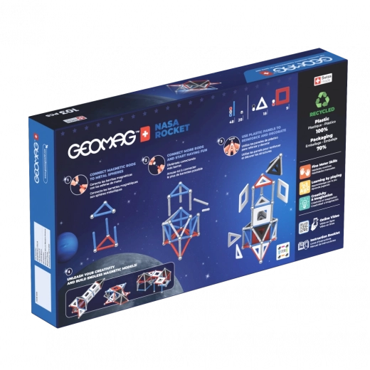 Tato limitovaná edice magnetické stavebnice GEOMAG vznikla ve spolupráci s NASA a nadchne malé i velké fanoušky vesmíru. Díky silným magnetům, lehkým rámům a kovovým spojům snadno sestavíte raketu, lunární modul i fantazijní konstrukce. Odolné díly a chytré propojení zaručují stabilitu modelů a hladké hraní.