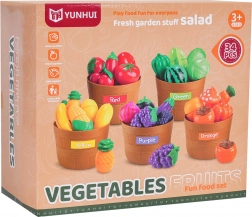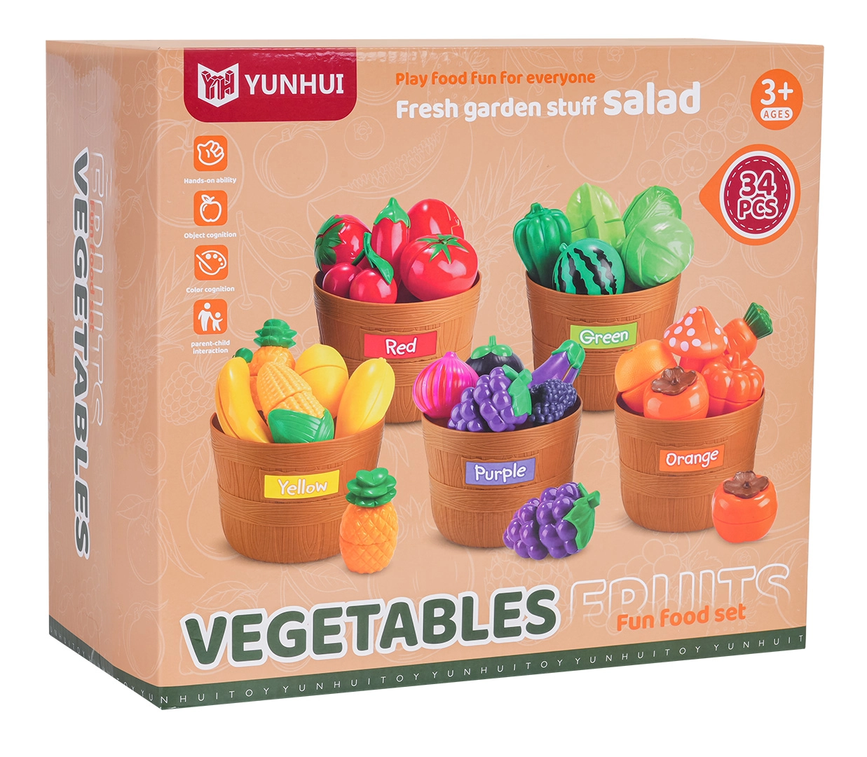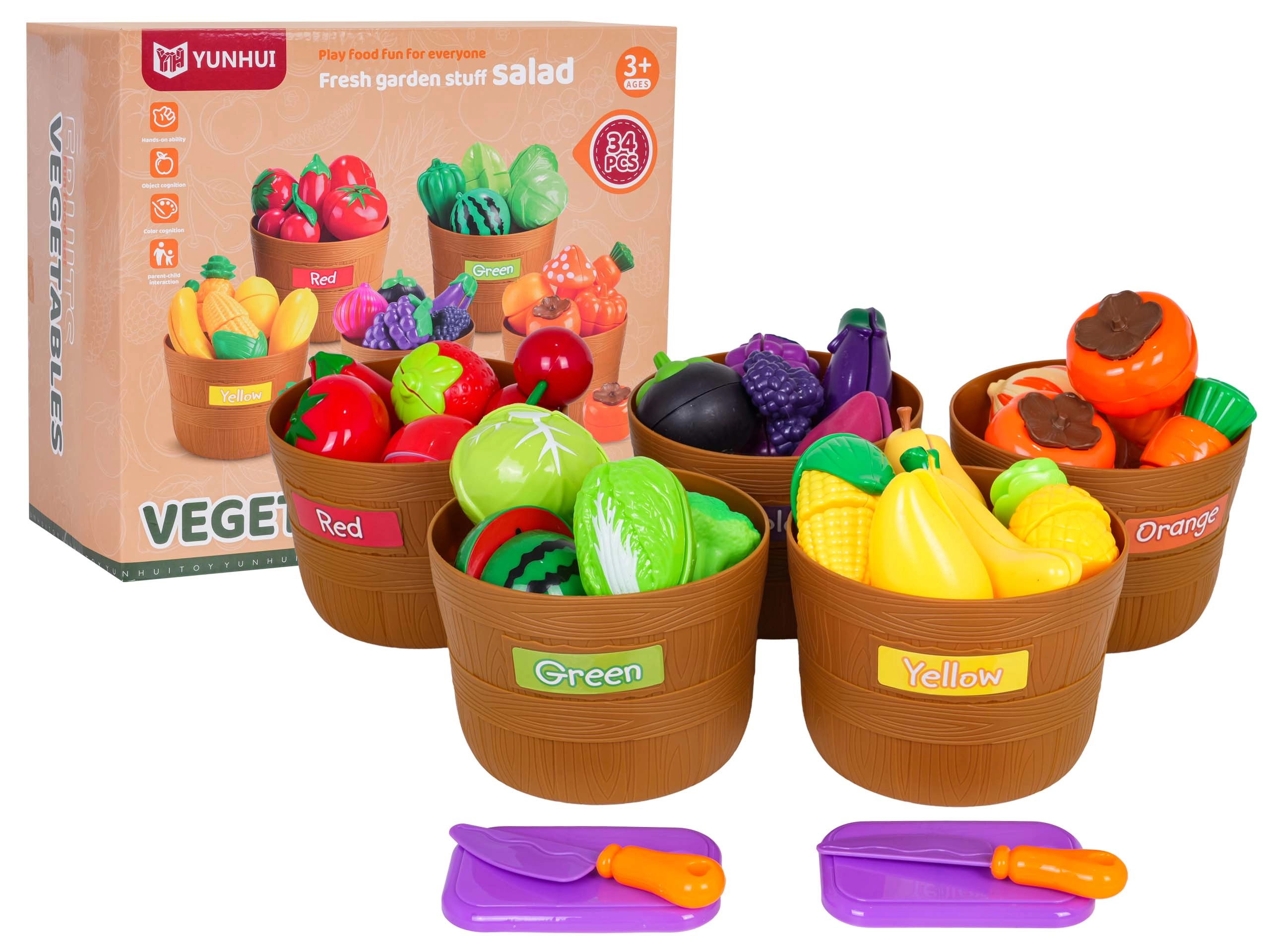 Objevte zábavnou didaktickou sadu ovoce a zeleniny pro děti od 3 let. Set obsahuje 34 dílů, včetně ovoce a zeleniny na suchý zip pro „krájení“, 5 košíků na třídění podle barev a 2 prkének s noži. Kvalitní plast v živých barvách rozvíjí jemnou motoriku, učení barev a podporuje kreativní hru na kuchyni.