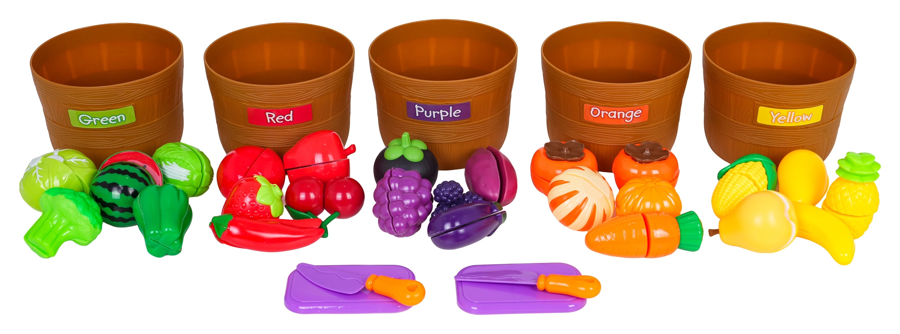 Tato barevná sada je ideální pro malé kuchaře a kuchařky. Děti mohou ovoce a zeleninu rozdělovat do barevně označených košíků (žlutá, fialová, oranžová, zelená, červená) a díky spojení na suchý zip je bezpečně „krájet“ na přiložených prkénkách. Pevné provedení z kvalitního plastu vydrží každodenní hraní.