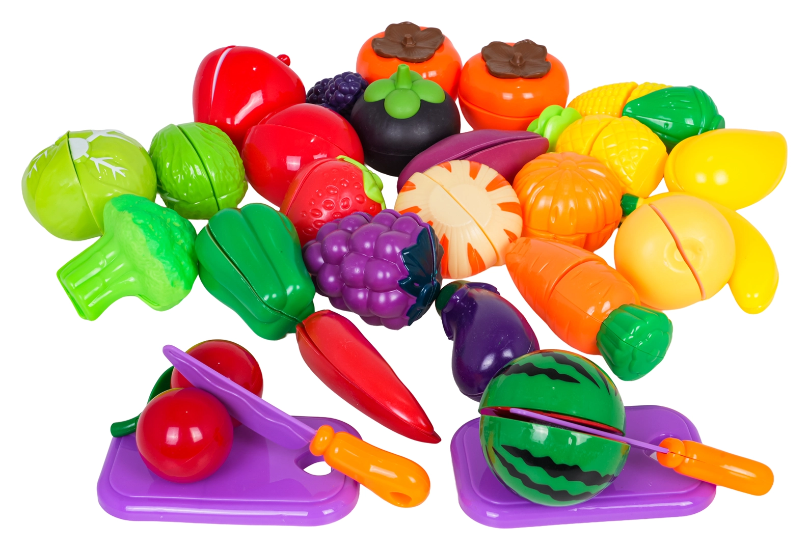 - Realistické plody: banán, citron, kukuřice, ananas, rajče, jahoda, mrkev, lilek, salát, paprika a další