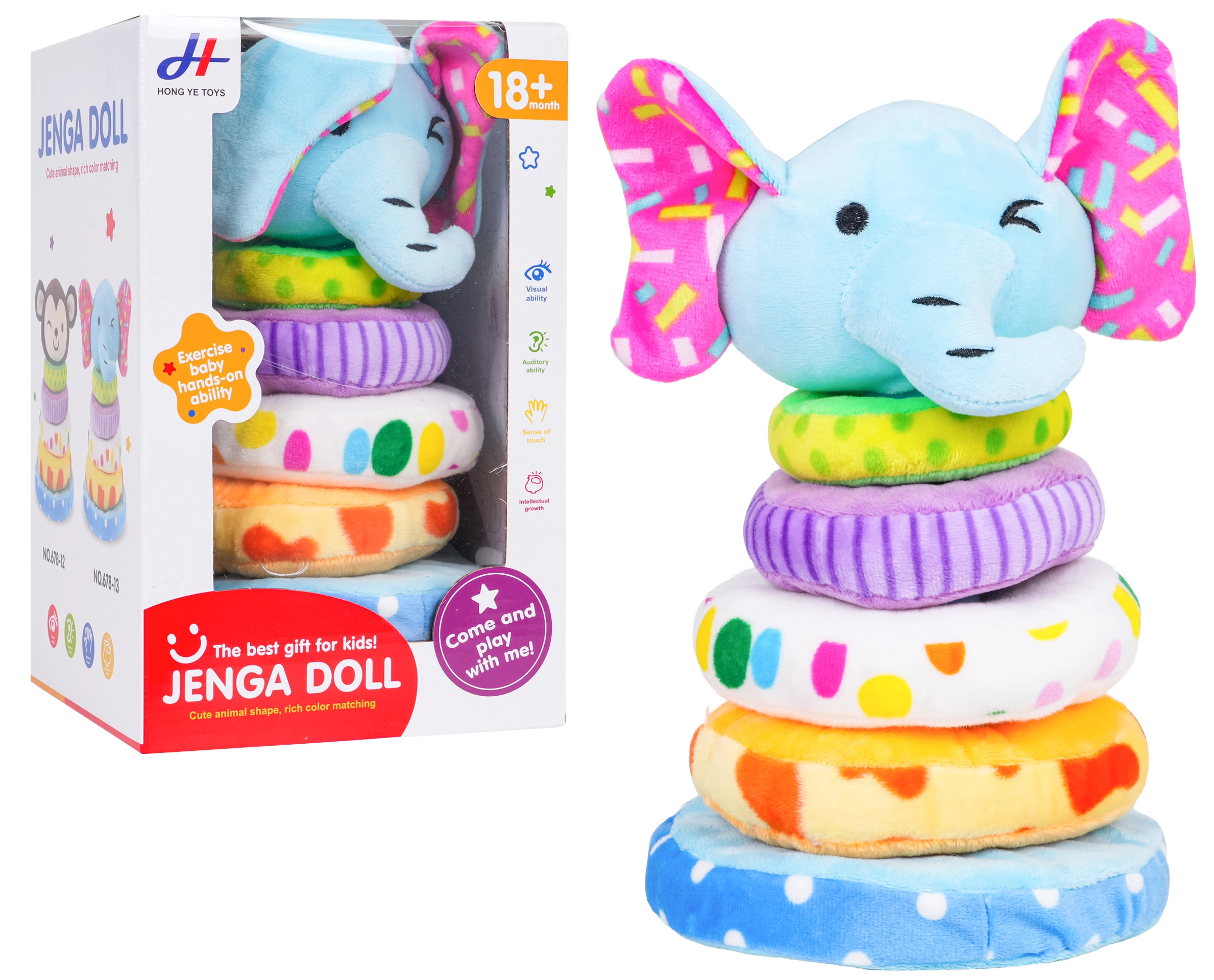 Tato měkká plyšová pyramida ve tvaru slona je skvělou první edukativní hračkou. Děti si procvičí navlékání 4 kroužků různých velikostí na měkký trn a naučí se třídění podle velikosti i barev. Pískátko v hlavě slůněte odmění každý stisk veselým zvukem a rozvíjí sluchové vnímání.