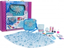 Okouzlující sada pro malé princezny spojuje dětské líčení a převlékání do ledově modrého stylu. Najdete v ní tiulovou (tulovou) sukýnku, třpytivou kabelku a bohatou výbavu bezpečných, hypoalergenních dětských kosmetických doplňků, které se snadno smývají.