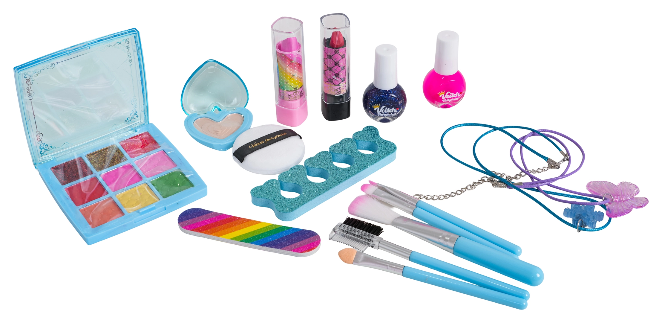 - Tiulová (tulová) sukýnka, ozdobná kabelka, 2× náhrdelník, paletka se 6 stíny a 3 třpytivými lesky, oční stín v krabičce ve tvaru srdce, 2× rtěnka, 2× lak na nehty, 4× štětec na líčení a kartáček na obočí/řasy, houbička na odlíčení, separátor prstů, pilník na nehty, dárkové balení