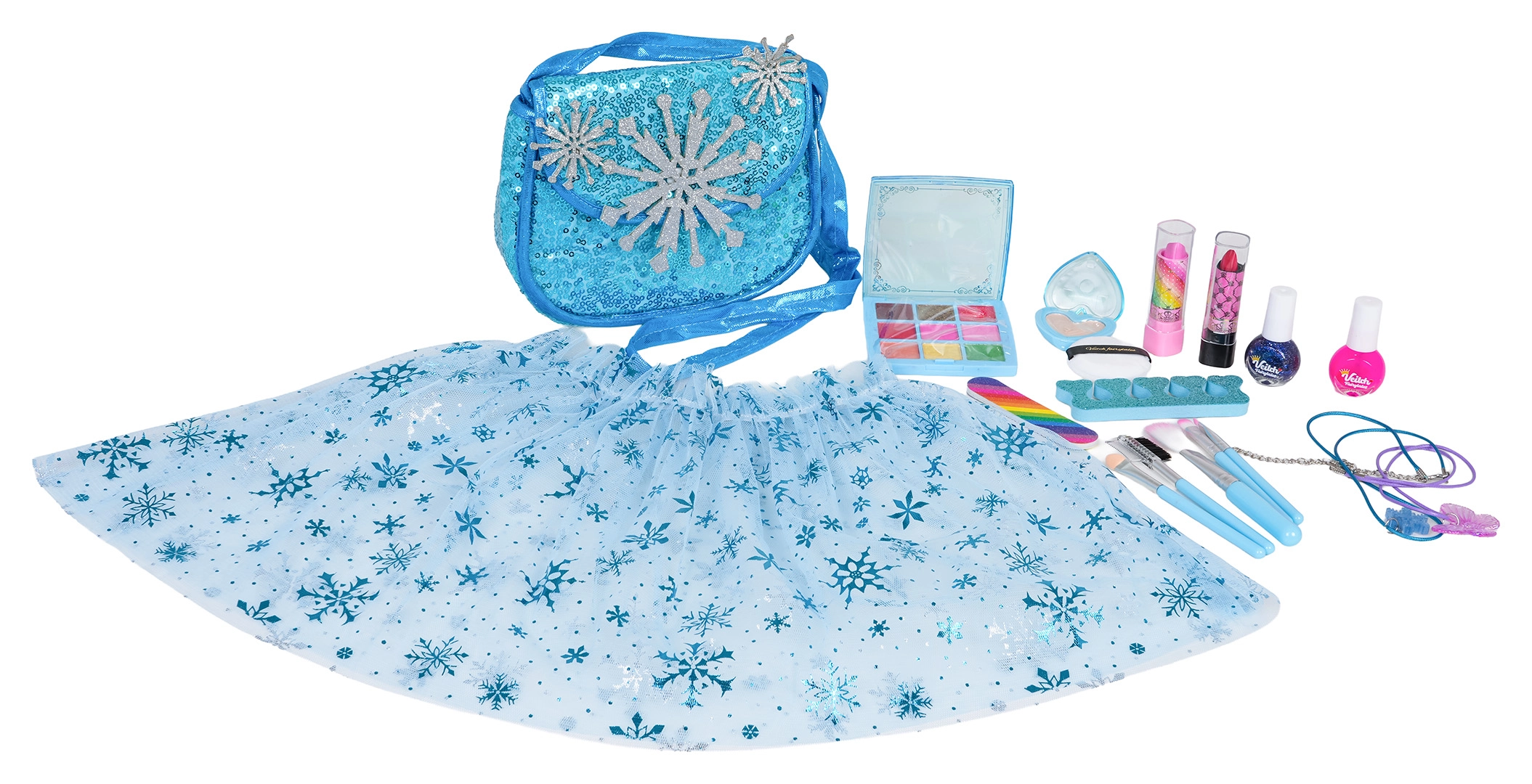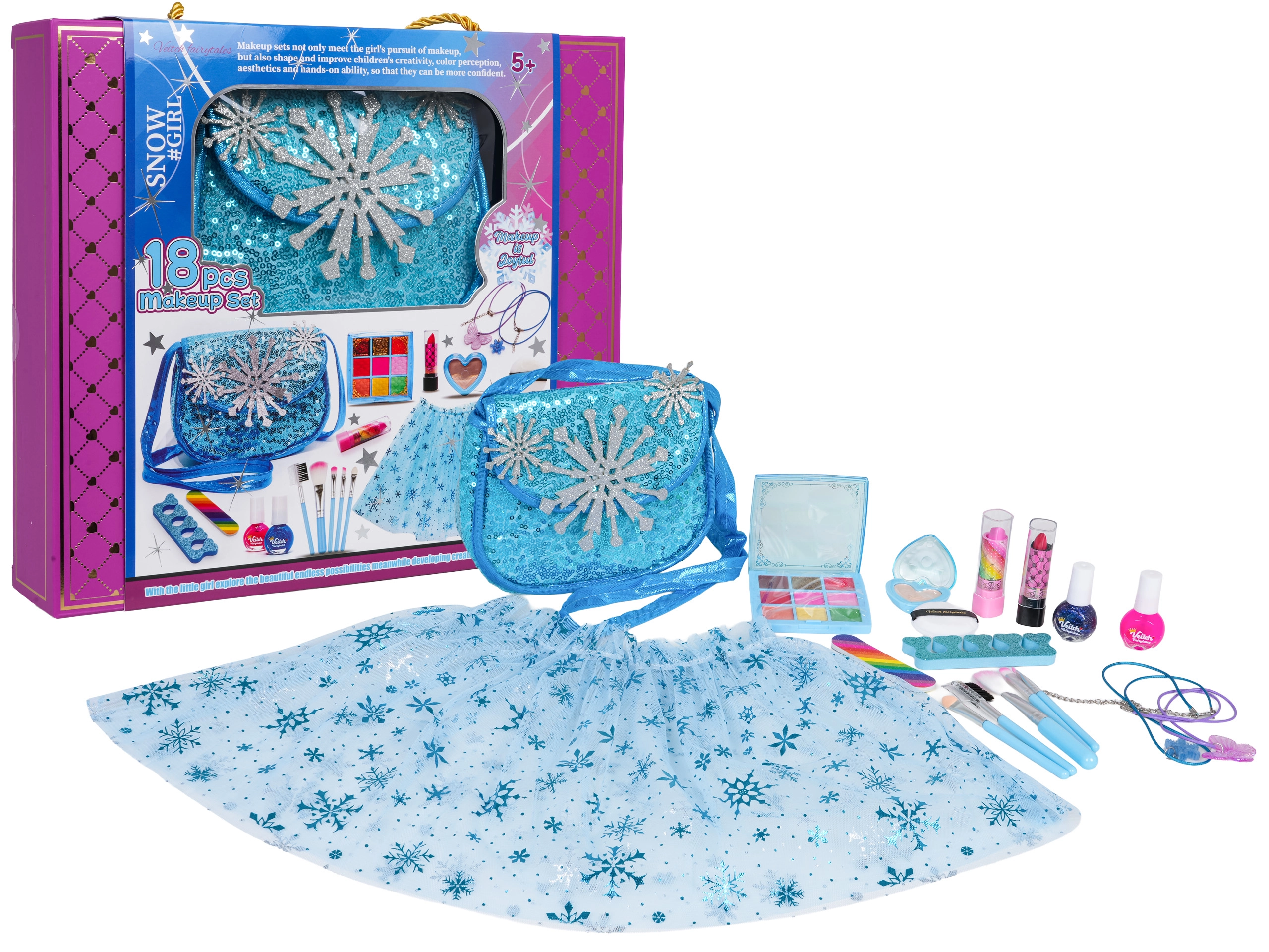 Součástí je třívrstvá tiulová (tulová) sukýnka se sněhovými vločkami, elegantní kabelka přes rameno a praktická kosmetická paletka, laky, lesky, štětečky i doplňky do vlasů a na nehty. Vše je uloženo v dárkovém balení s uchem – ideální jako dárek.