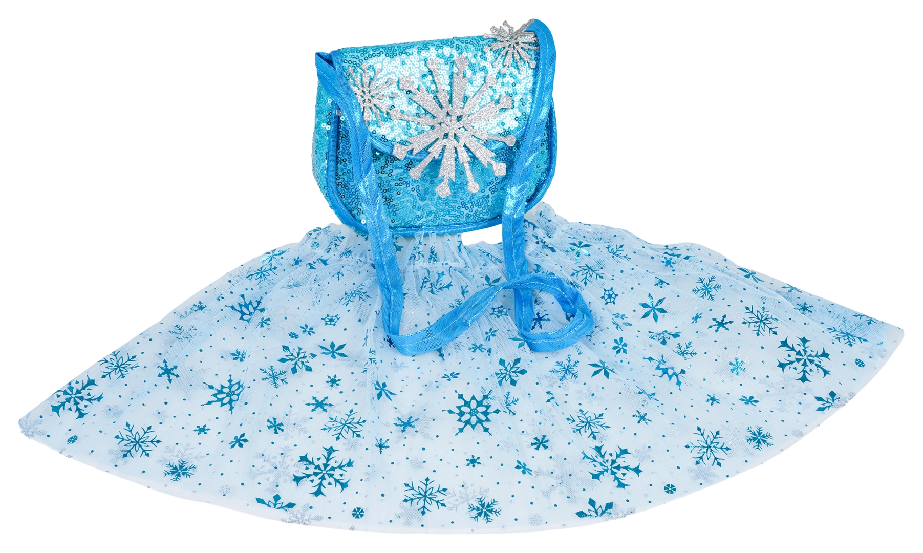 Lehká tiulová (tulová) sukýnka se sněhovými vločkami a ladící třpytivá kabelka vytvoří dokonalý ledový outfit pro každou malou princeznu.