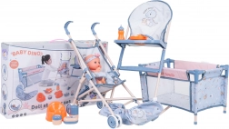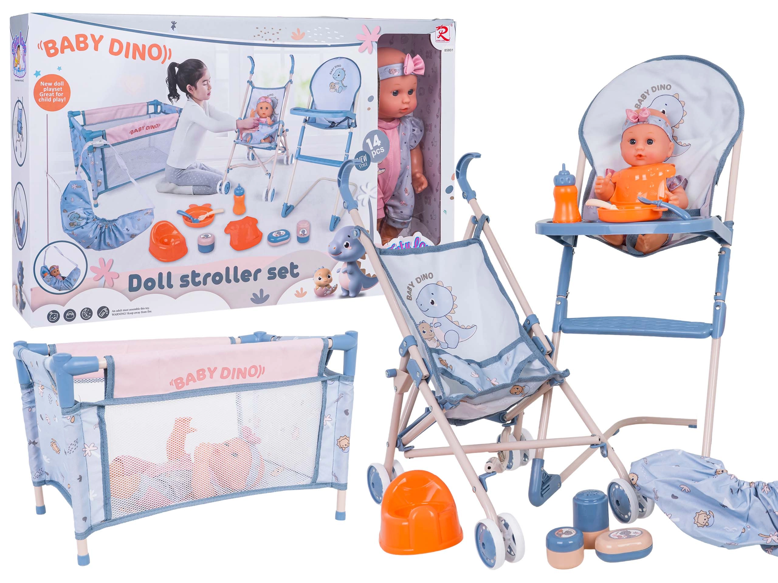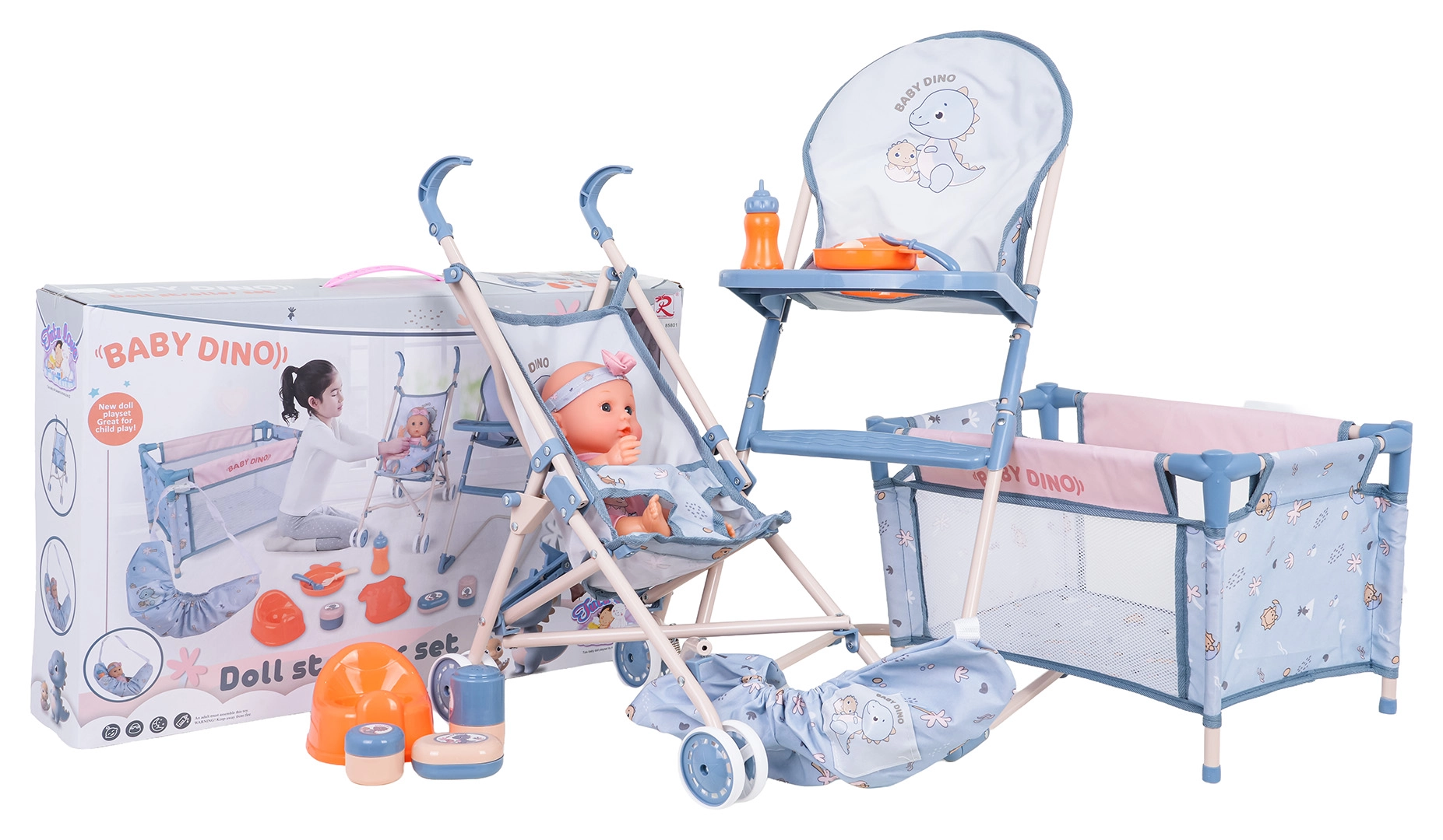 Tato mega sada BABY DINO přináší dětem spoustu možností pro kreativní a realistickou hru na pečování. Panenka má pohyblivé ruce a nohy, je oblečená do barevných dupaček s čelenkou a může pít z lahvičky a dělat „čůrání“ do nočníku. Díky lehkému kočárku, cestovní postýlce a jídelní židličce mohou děti panenku krmit, vozit i uspávat.