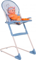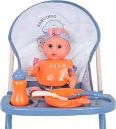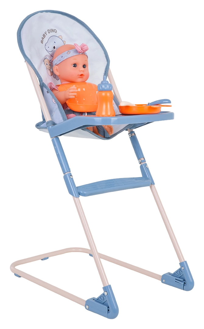 Pohodlné krmení panenky díky vysoké židličce s odnímatelným podnosem a sadou příborů, talířkem, bryndáčkem a lahvičkou. Ideální pro realistické scénáře péče.