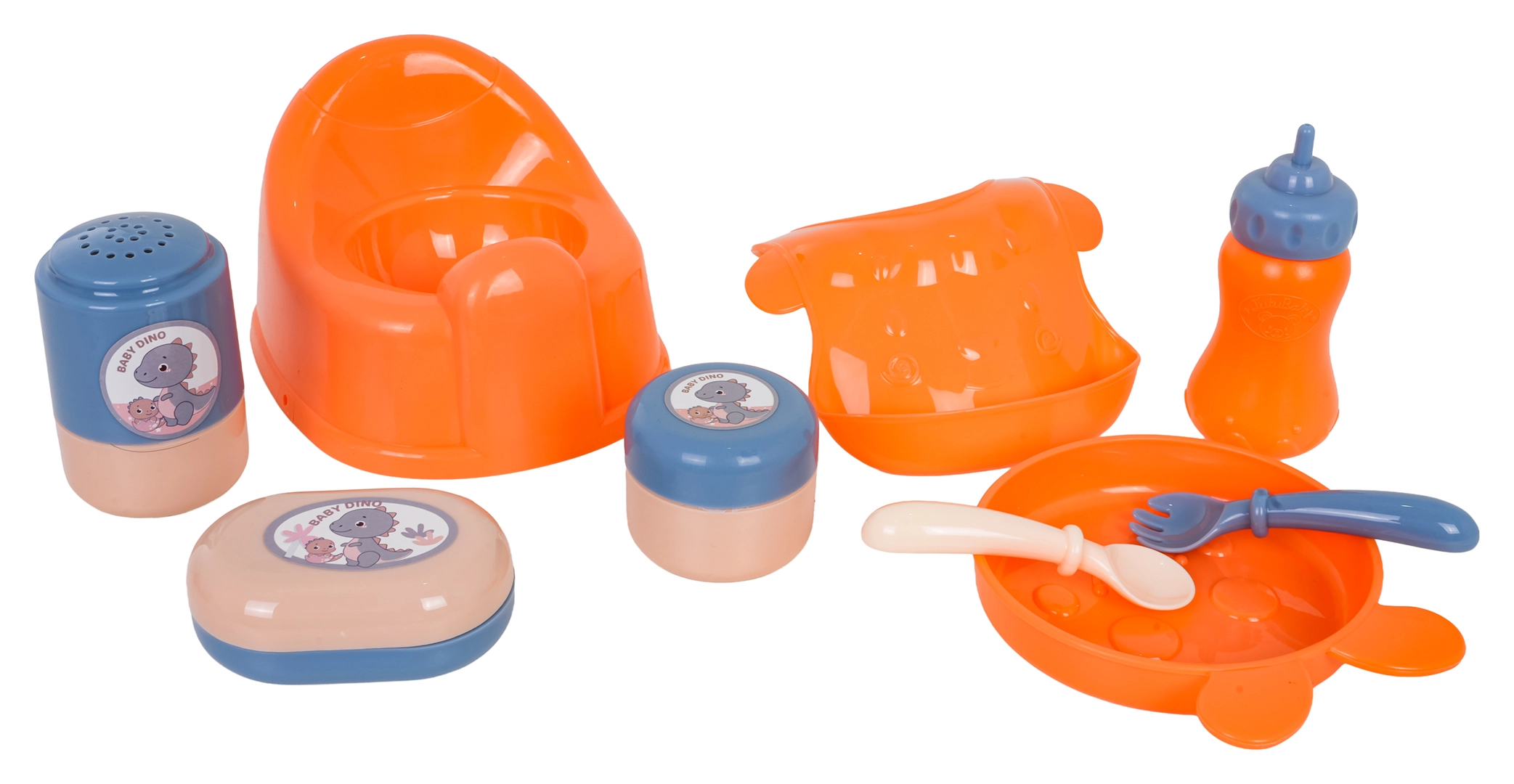 Objevte bohatě vybavenou sadu pro hry na maminku s roztomilou panenkou BABY DINO a 14 díly příslušenství. Najdete v ní kočárek, jídelní židličku, cestovní postýlku, nočník, láhev i krmící doplňky. Díky bezpečným materiálům, živým barvám a možnosti napájet panenku a učit ji na nočník je set ideální pro děti od 3 let.
