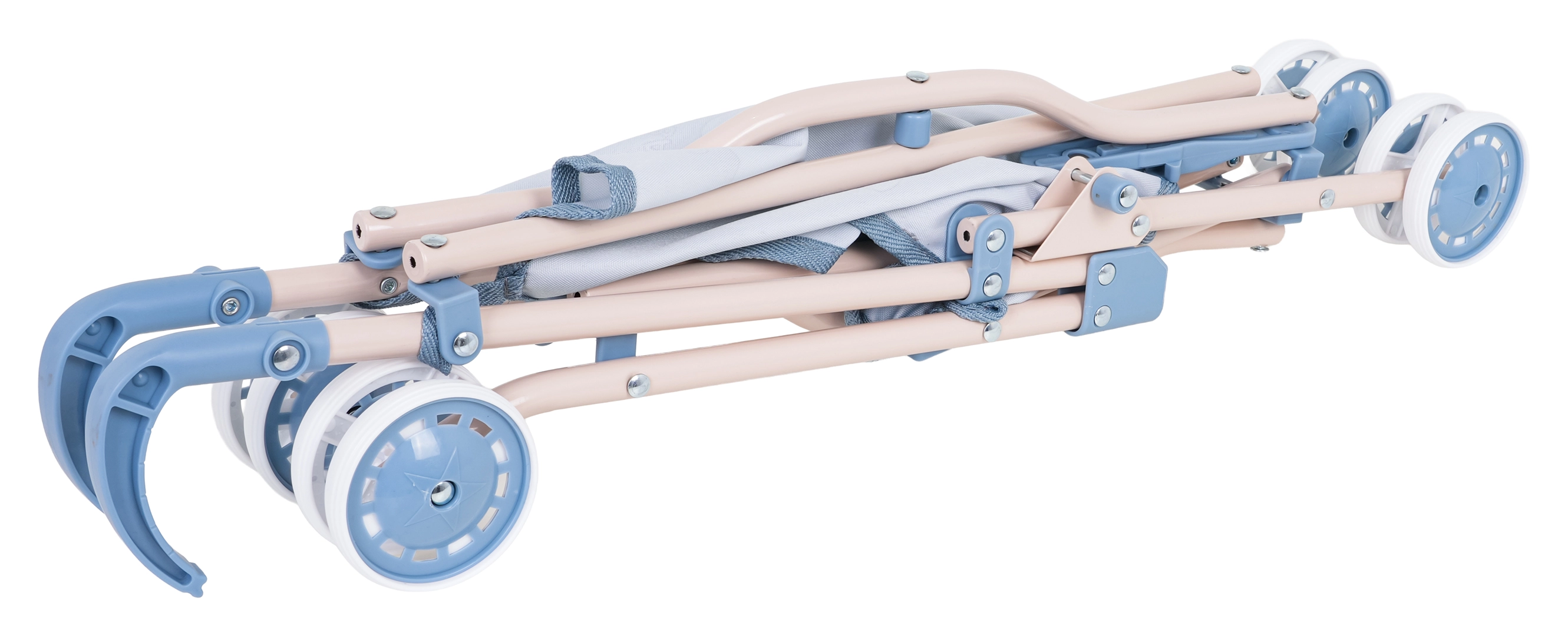 Lehký kočárek s dvojitými kolečky a bezpečnostním páskem se jednoduše skládá pro úsporu místa. Skvělý pro hraní doma i na cestách.