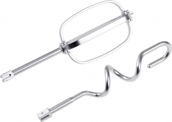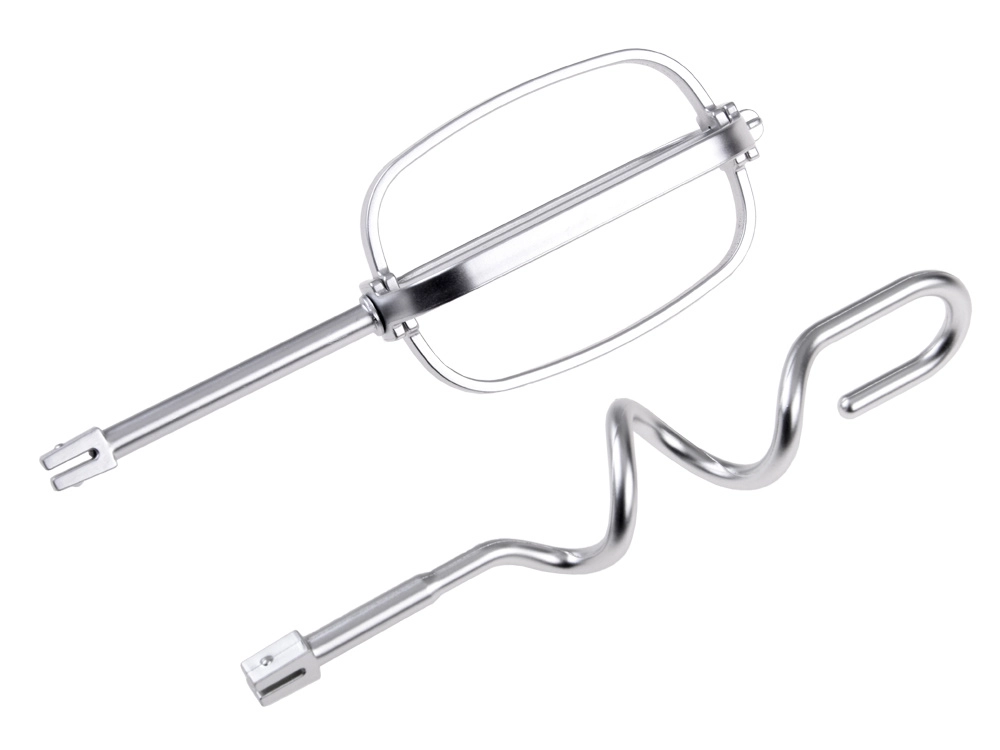 Součástí setu jsou metla a hnětací hák spolu s praktickou miskou – ideální pro různé typy herních receptů.