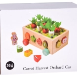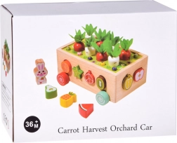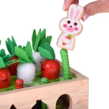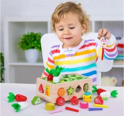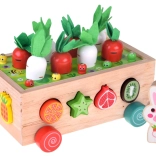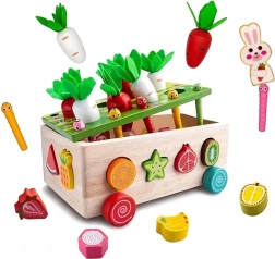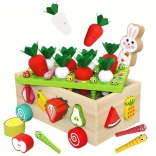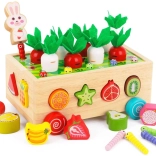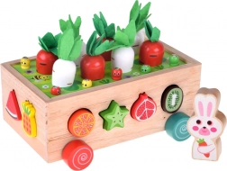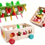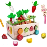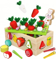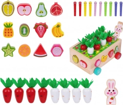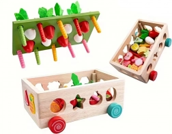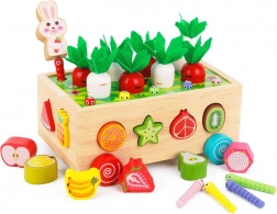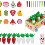 Tento víceúčelový dřevěný set v duchu Montessori přináší dětem pestrou škálu činností: sázení a vytahování mrkviček s filcovými natěmi, magnetické chytání červíků pomocí figurky králíčka a klasické třídění barevných ovocných tvarů do odpovídajících otvorů. Díky robustnímu provedení a hladkým hranám je hračka bezpečná a odolná pro každodenní hraní.