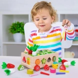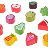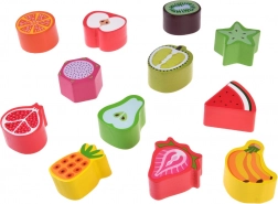 Sada obsahuje sadu pestrobarevných ovocných dílků pro vkládání do odpovídajících otvorů. Děti se učí barvy, tvary i názvy ovoce a trénují logiku.