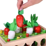 Děti „sázejí“ a vytahují dřevěné mrkvičky a ředkvičky s měkkými filcovými listy – skvělý trénink úchopu, síly prstů a koordinace oko–ruka.