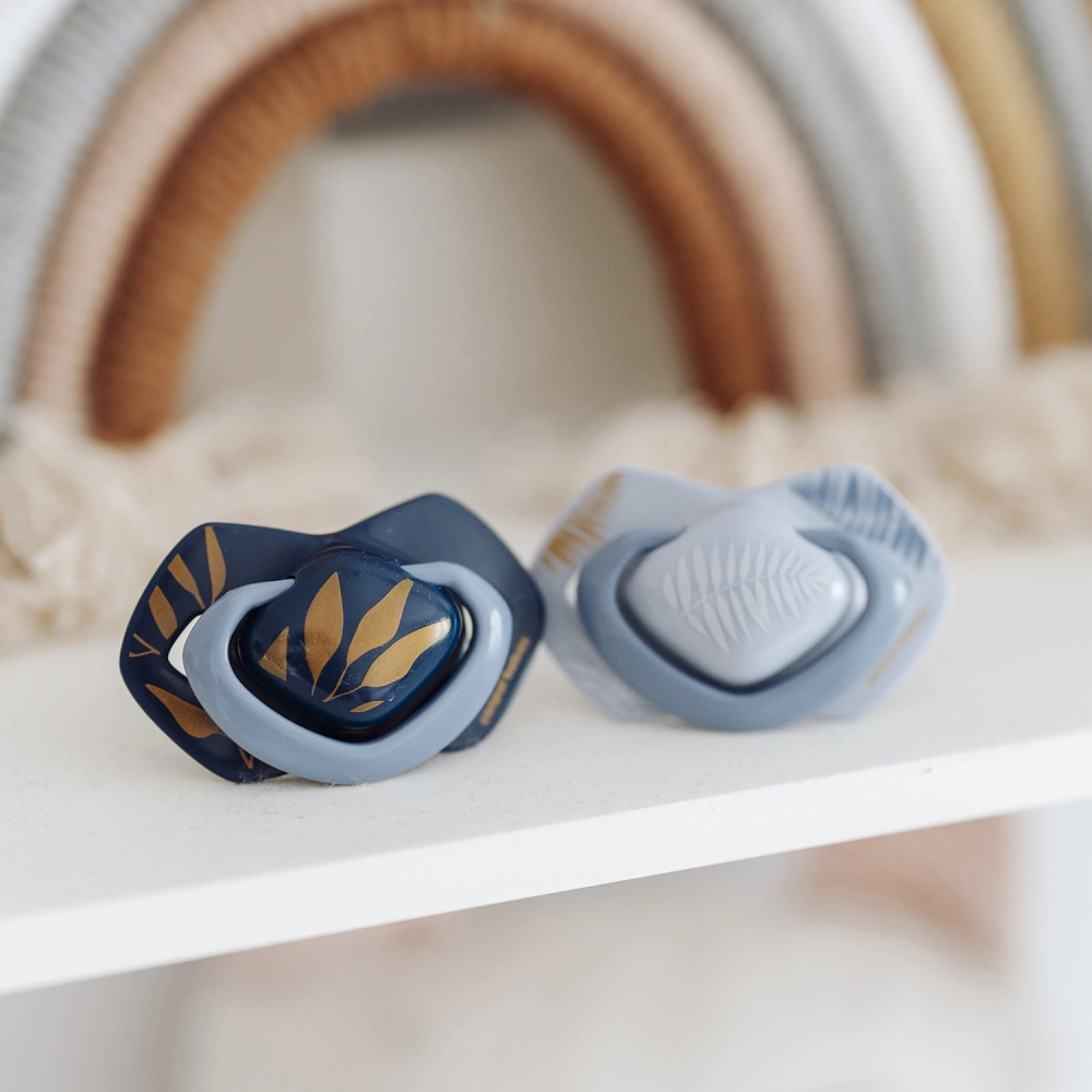 Součástí je dezinfekční pouzdro, které umožňuje jednoduché a rychlé čištění v mikrovlnné troubě během 2 minut – ideální pro každodenní hygienu. Dudlíky jsou bez BPA, vyrobené v EU a odolné proti deformaci, takže vydrží i náročné používání.