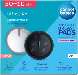 Diskrétní a pohodlné kojicí vložky Canpol babies s 3D anatomickým tvarem spolehlivě chrání před protečením. Mají ultraabsorpční jádro, jsou velmi tenké (1,3 mm), měkké a prodyšné, takže nedráždí citlivá prsa. Díky 2 lepicím proužkům zůstanou bezpečně na místě a nabízí rychlý pocit sucha po celý den. Balení 60 + 10 zdarma v elegantní černé barvě.
