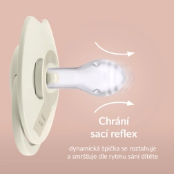 Dynamický dudlík LOVI PRIME se přizpůsobuje rytmu sání dítěte – špička ze silikonu různé tloušťky se přirozeně roztahuje a smršťuje, čímž chrání sací reflex a nenarušuje kojení. Symetrický tvar savičky připomíná bradavku naplněnou mlékem, takže dítěti poskytuje známý a uklidňující pocit.