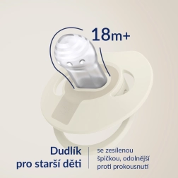 Profilovaný štítek s ventilačními otvory usnadňuje dýchání nosem, minimalizuje kontakt s pokožkou a snižuje riziko podráždění. Dudlík je velmi lehký, odolný proti deformaci v ústech a u velikosti 18m+ má zesílenou špičku pro vyšší odolnost. Jemný silikon je antialergický.