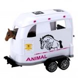 Bílý dvounápravový přívěs s potiskem koně lze snadno odpojit. Uvnitř je figurka koně pro samostatnou hru.